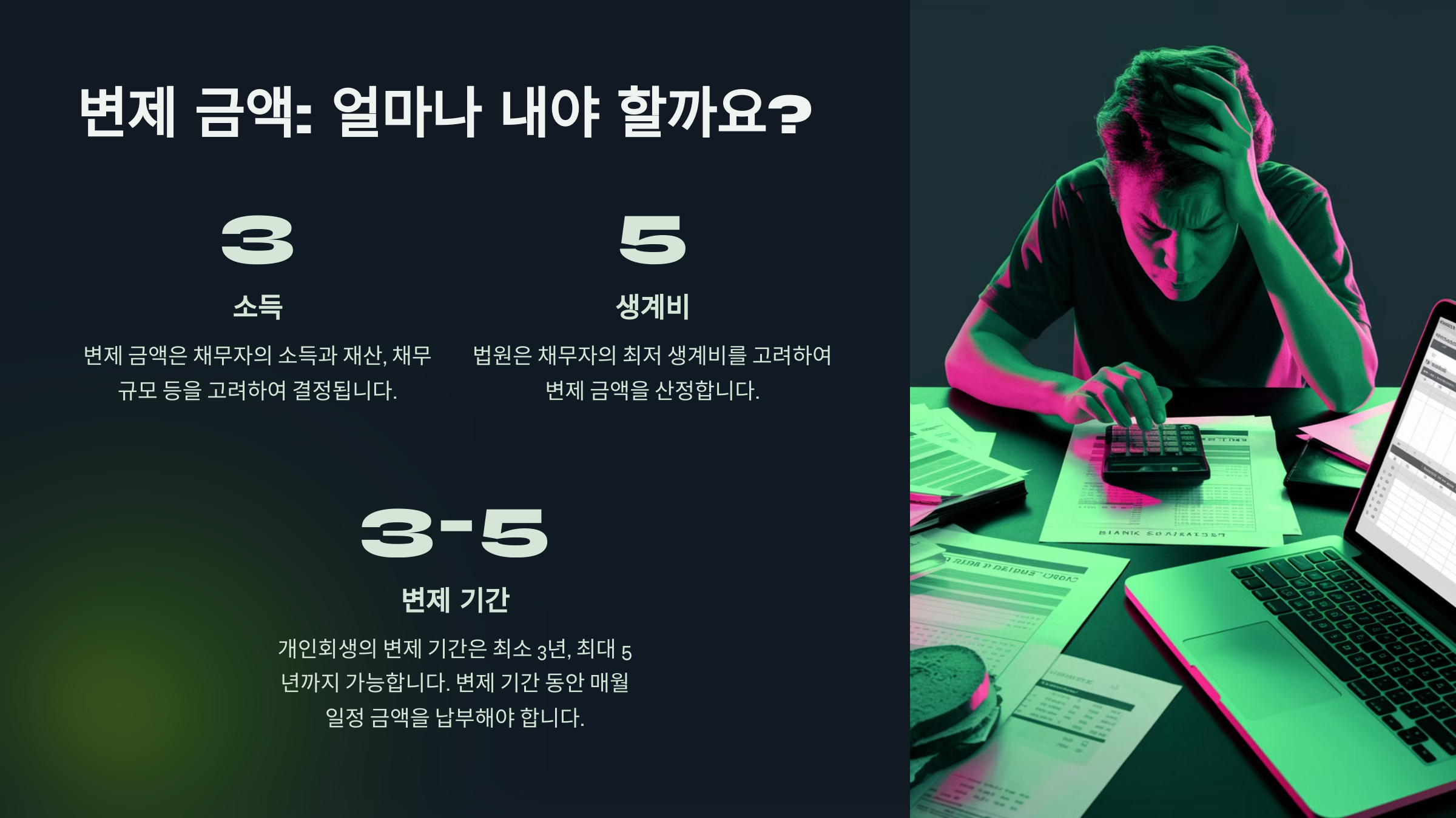 개인회생 변제금은 신청자의 소득, 채무 규모, 생활비 등을 고려하여 산정됩니다.